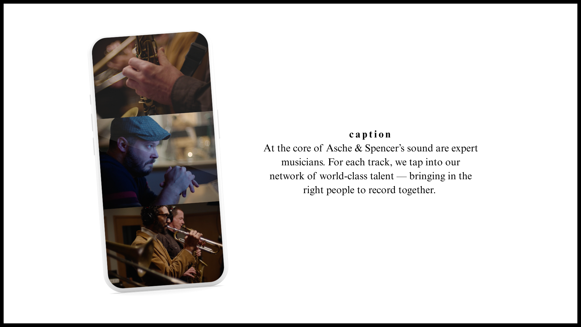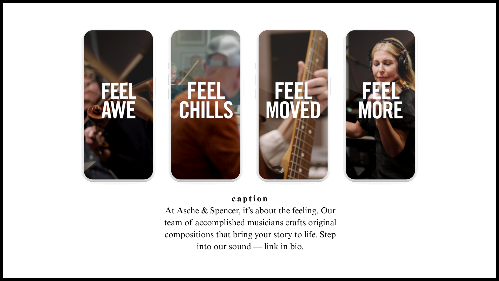 I wrote for the social launch of Asche & Spencer — a renowned music production studio specializing in composing and recording original music since 1990. We grounded the launch in our “Feel More” campaign, which sought to honor Asche & Spencer’s raw, human sound (amid a growing sea of computer-generated music).