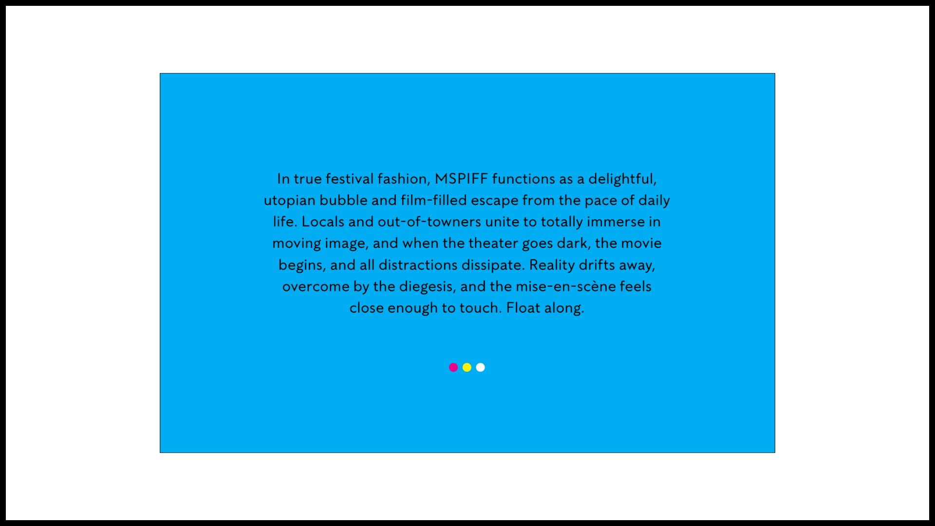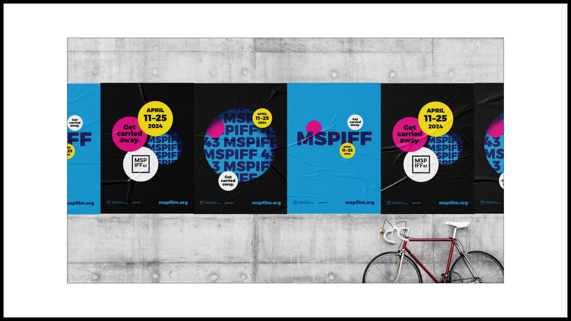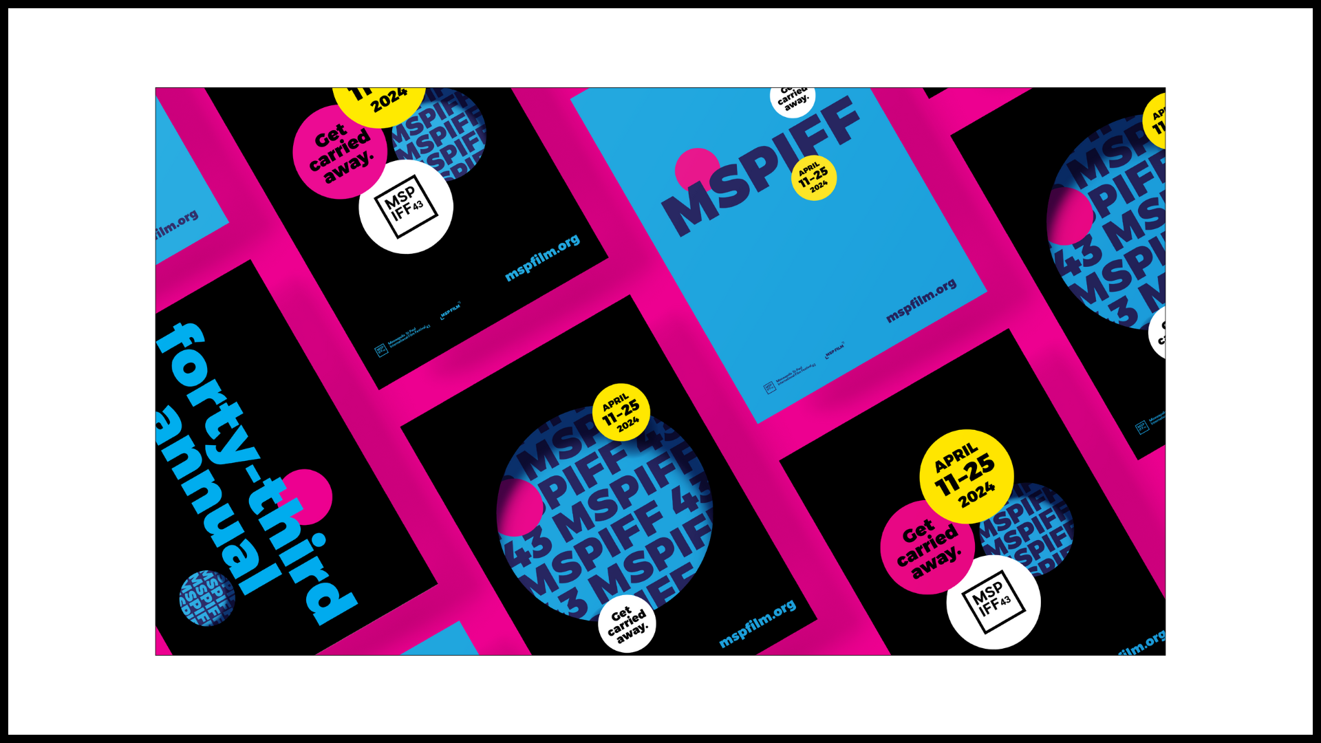 We developed the visual identity for MSP Film Society’s 43rd rendition of the Minneapolis/St. Paul International Film Festival (MSPIFF), which showcases over 200 films from around the world along with filmmaker panels and parties. I crafted a thematic manifesto that guided our creative direction and composed a public-facing hero line: “Get carried away.”